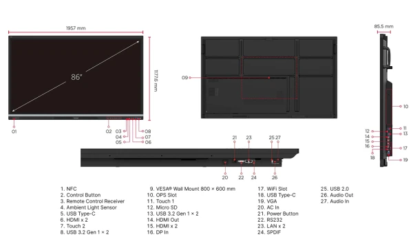 Sadržaj pakovanja Napojni kabl, USB-C kabl, USB touch kabl, 2 olovke, uputstvo, RS232 adapter, stezaljke, nosač kamere, šrafovi, HDMI kabl, daljinski upravljač, AAA baterije, izjava o usklađenosti